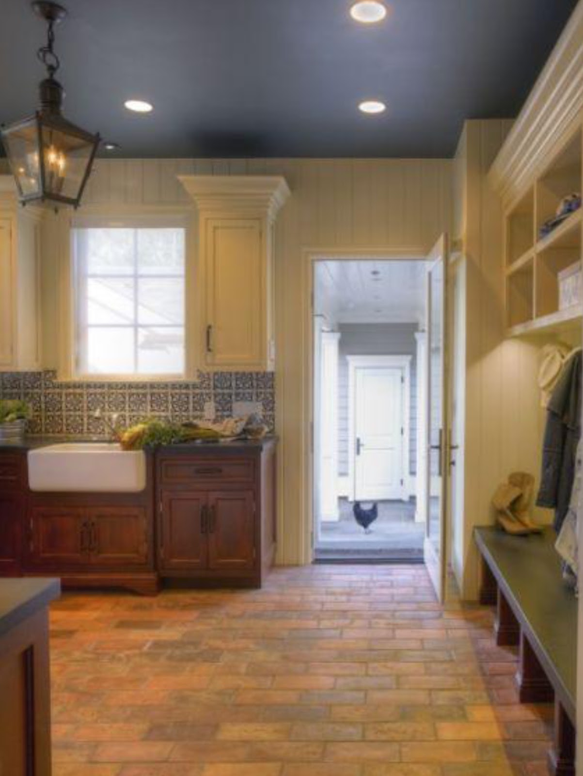 8. Bridge floors and walls. Sometimes a contrasting cabinet finish can provide a visual transition between the wall treatment and the flooring. The warm cherry-tone lower cabinets in this classic kitchen extend the warmth of the brick underfoot and also create a buffer between the white units and the darker floor and backsplash materials.